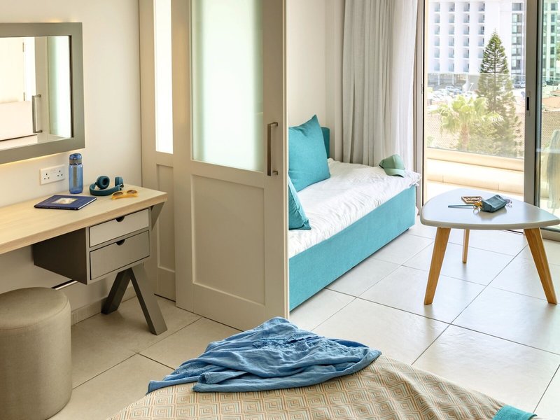 - Family 4 Pool view room with partition (FZX5), Familienzimmer, Nichtraucherzimmer, Poolblick, ca. 32 m², letzte Komplettrenovierung 2016, Gesamtanzahl der Räume in diesem Zimmertyp: 2, Aufteilung wie folgt: optisch abgetrenntes Kinderzimmer, 1 Schlafzimmer, 1 King Size Bett, 2 Schlafsofas, Babybett: ohne Gebühr, Anfrage notwendig, Klimaanlage: zentral gesteuert, Heizung: zentral gesteuert, Fußboden: Fliesenboden, Safe: ohne Gebühr, Sitzecke, Sofa, Kühlschrank, Kaffee-/Teezubereiter, Wasserkocher, Minibar: gegen Gebühr, Telefon, Internet: WLAN/WiFi: ohne Gebühr, Fernseher: deutsches Programm, Sat-TV, Radio, Roomservice: gegen Gebühr, Badewanne oder Dusche, WC, Bademantel: ohne Gebühr, Slipper: ohne Gebühr, Föhn, Balkon oder Terrasse: mit Sitzgelegenheit