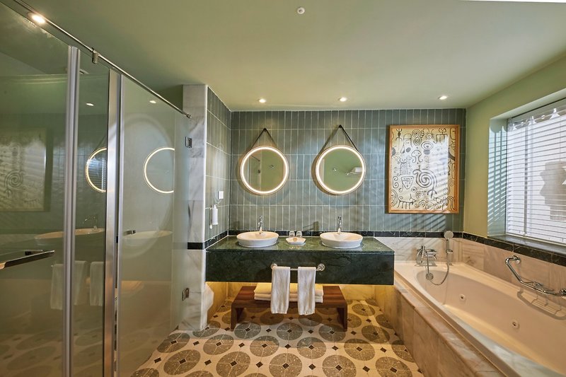 - 41-45 m2, junior suite, deluxe, posedenie, manželské postele (1 king alebo 2 queen size), 1 rozkladacia pohovka, sprcha, vírivá vaňa, WC, župan, papuče, sušič vlasov, kozmetické zrkadlo, klimatizácia, ventilátor , minibar, trezor, žehliaca doska, žehlička, TV , kávovar, terasa (zariadená), priamy prístup k bazénu, spoločný bazén