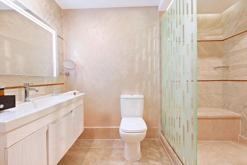 Rodinná izba (FZP, cca 64 m²), 2 spálne (manželská posteľ a dve samostatné lôžka), oddelené dverami, klimatizácia, minibar, 36-palcový TV, telefón, trezor, rýchlovarná kanvica, Wi-Fi. Sprcha, WC, fén. Balkón/terasa s výhľadom do záhrady/bazénu. Max. 4 dospelí