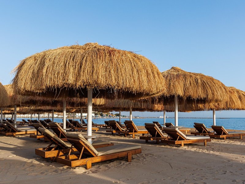 - Strand: Sand, Strandlänge: ca. 400 m, privat, Liegen: ohne Gebühr, Sonnenschirme: ohne Gebühr