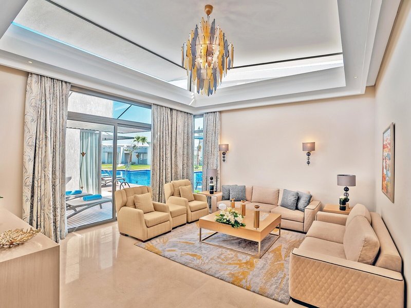 - Executive Pool Villa (VIG1), Nichtraucherzimmer, Poolseite, Poolblick, Gartenblick, ca. 240 m², Gesamtanzahl der Räume in diesem Zimmertyp: 4, Aufteilung wie folgt: Wohnzimmer, 3 Schlafzimmer, 1 Einzelbett, 1 Doppelbett, 1 King Size Bett, Klimaanlage: individuell regelbar, kalt, warm, Fußboden: Teppichboden, Safe: ohne Gebühr, Sofa, Schreibtisch, Kühlschrank, Espressomaschine, Kaffee-/Teezubereiter, Wasserkocher, Esstisch, Minibar: ohne Gebühr, bei All Inclusive inklusive, Softdrinks: ohne Gebühr, bei All Inclusive inklusive, Wasser: ohne Gebühr, bei All Inclusive inklusive, alkoholische Getränke: ohne Gebühr, bei All Inclusive inklusive, Snacks: ohne Gebühr, bei All Inclusive inklusive, Minibarauffüllung, Telefon, Internet: WLAN/WiFi: ohne Gebühr, Fernseher: Flatscreen, im Wohnbereich, im Schlafzimmer, im Kinderzimmer, Sat-TV, Roomservice: gegen Gebühr, Reinigungsservice, Badewanne oder Dusche, Dusche, WC, Bademantel, Slipper, Föhn, Kosmetikspiegel, Terrasse: mit Sitzgelegenheit, mit direktem Poolzugang
