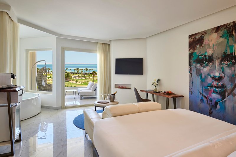 Penthouse: Die in den oberen Etagen angelegten Penthouse Suiten (P2) sind ausgestattet wie die Jacuzzi Suiten, sind jedoch mit ca. 107 m² (inkl. 16 m² Balkon) geräumiger, mit eigenem Wohnzimmer, eigenem Pool (im Winter beheizbar) und einem atemberaubendem Blick über das Rote Meer.