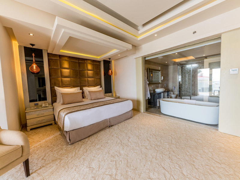 - Jacuzzi Suite (SUX1), Suite, Nichtraucherzimmer, Mindestalter im Zimmer: 16 Jahre, Neubau, Poolseite, Poolblick, ca. 90 m², letzte Komplettrenovierung 2019, Gesamtanzahl der Räume in diesem Zimmertyp: 1, Aufteilung wie folgt: kombiniertes Wohn-/Schlafzimmer, 1 King Size Bett (240x200cm), Klimaanlage: ohne Gebühr, individuell regelbar, kalt, Heizung: individuell regelbar, Fußboden: Teppichboden, Safe: ohne Gebühr, Sofa, Schreibtisch, Kaffee-/Teezubereiter, Wasserkocher, Minibar: ohne Gebühr, Softdrinks: ohne Gebühr, Wasser: ohne Gebühr, Minibarauffüllung: täglich, wöchentlich, Telefon, Internet: WLAN/WiFi: ohne Gebühr, Fernseher: Flatscreen, im Schlafzimmer, Sat-TV, Roomservice: täglich, gegen Gebühr, Reinigungsservice: täglich, ohne Gebühr, Dusche, Regendusche, Badewanne, WC, Bademantel: ohne Gebühr, Slipper: ohne Gebühr, Bad durch Glaswand getrennt, Föhn, Kosmetikspiegel, Balkon: mit Whirlpool, mit Sitzgelegenheit