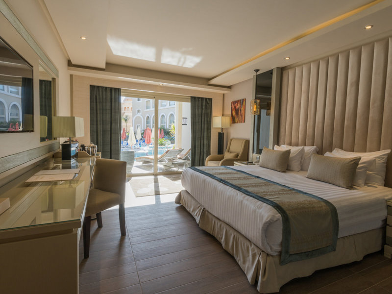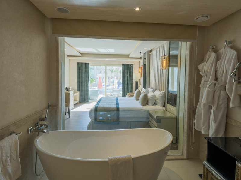 - Deluxe Swim Up Room (DZX3), Doppelzimmer, Nichtraucherzimmer, Mindestalter im Zimmer: 16 Jahre, Neubau, Poolseite, Poolblick, ca. 46 m², letzte Komplettrenovierung 2019, letzte Teilrenovierung 2021, Gesamtanzahl der Räume in diesem Zimmertyp: 1, Aufteilung wie folgt: kombiniertes Wohn-/Schlafzimmer, 1 King Size Bett, Klimaanlage: ohne Gebühr, individuell regelbar, kalt, Heizung: individuell regelbar, Fußboden: Laminat, Safe: ohne Gebühr, Schreibtisch, Kaffee-/Teezubereiter, Wasserkocher, Minibar: ohne Gebühr, Softdrinks: ohne Gebühr, Wasser: ohne Gebühr, Telefon, Internet: WLAN/WiFi: ohne Gebühr, Fernseher: Flatscreen, im Schlafzimmer, deutsches Programm, Sat-TV, Roomservice: täglich, gegen Gebühr, Reinigungsservice: täglich, ohne Gebühr, Dusche, Regendusche, Badewanne, WC, Bademantel: ohne Gebühr, Slipper: ohne Gebühr, Bad durch Glaswand getrennt, Föhn, Kosmetikspiegel, Terrasse: mit Liegen, mit Sitzgelegenheit, mit direktem Poolzugang