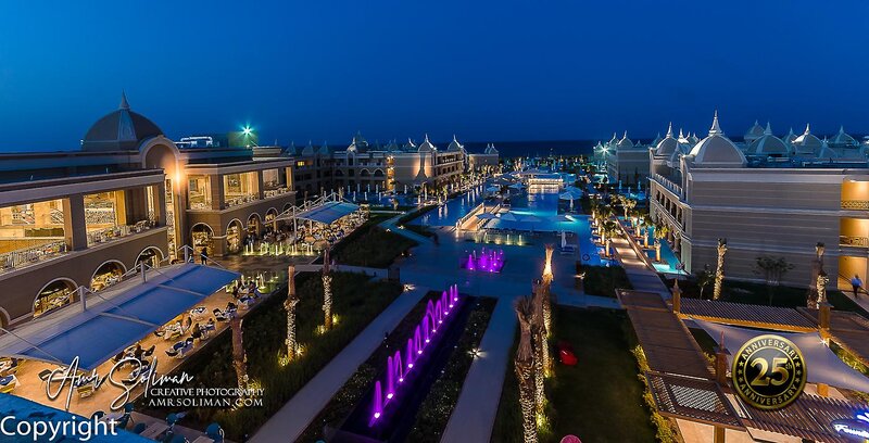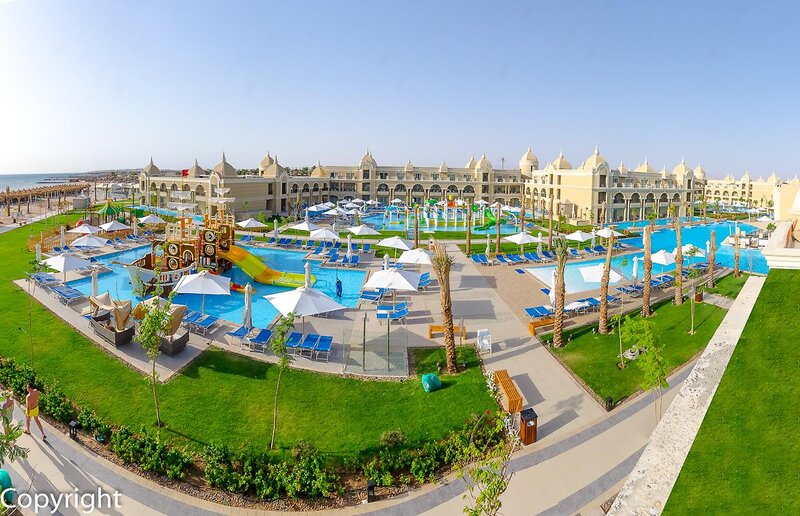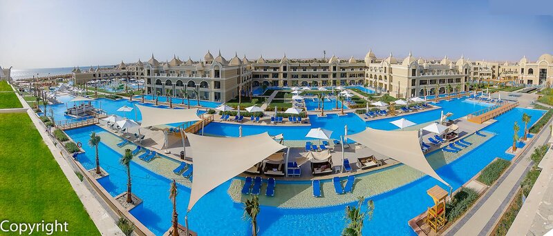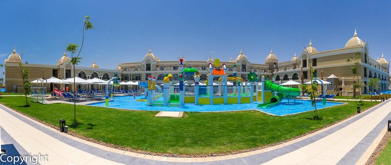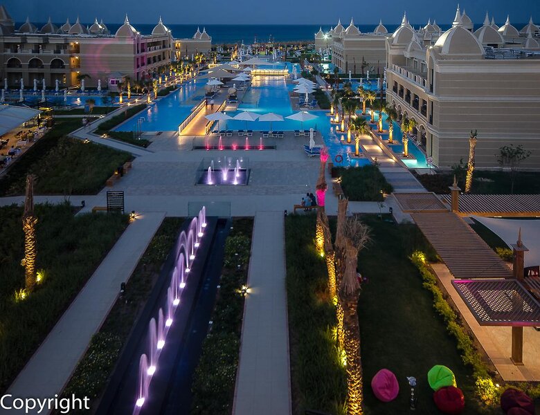 Ausstattung: Poollandschaft mit 6 Pools, Kinderpool, Wasserrutsche. Liegen, Schirme, Auflagen, Handtücher am Pool und am Strand (geg. Geb.), Beach-Bar, Pool-/Snackbar. Empfangshalle, Rezeption, Lobby-Bar, TV-Lounge. 5 Restaurants (Buffet & à la carte) mit italienischen und asiatischen Speisen, 5 Bars, Minimarkt, Shop, Friseur, Parkplatz (geg. Geb.). 387 Zimmer, 3 Etagen, Lift.