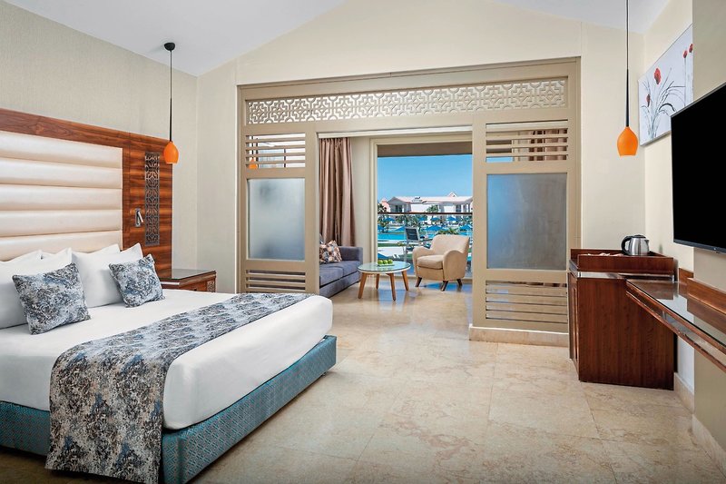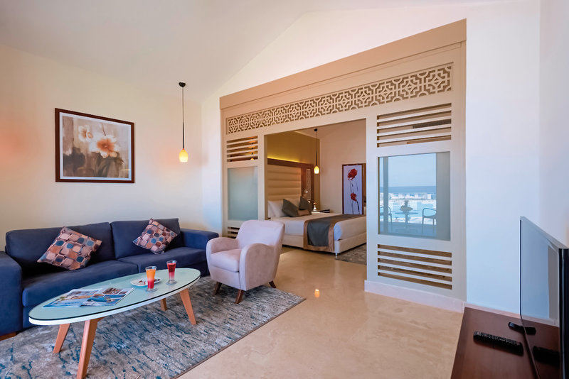 - 61-70 qm, Suite, Deluxe, Neubau, Poolblick, 2 Zimmer (optisch getrennt), 2 Einzelbetten, Doppelbett (Kingsize), Dusche, Haartrockner, Kosmetikspiegel, Klimaanlage, Minibar, Wasser, Safe, TV, Balkon oder Terrasse (möbliert)