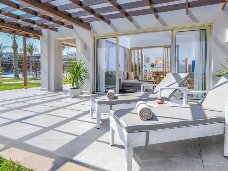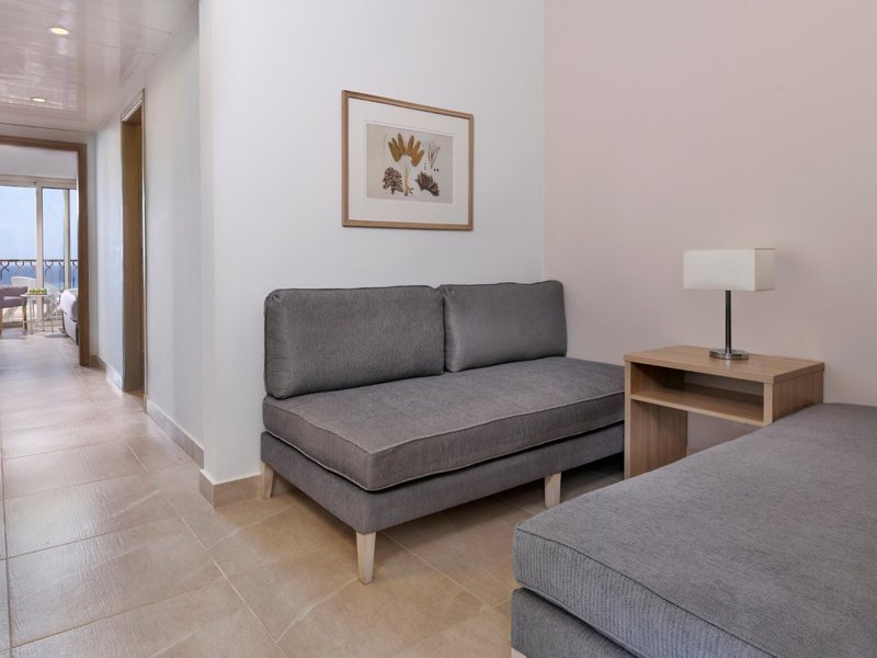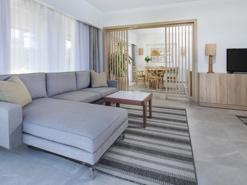 - Deluxe Family Room Pool Sea View (DZX3), Doppelzimmer, Nichtraucherzimmer, Meerseite, Poolseite, Meerblick, Poolblick, Blick auf Pool and sea, ca. 45 - 45 m², Gesamtanzahl der Räume in diesem Zimmertyp: 1, Aufteilung wie folgt: kombiniertes Wohn-/Schlafzimmer, 2 Einzelbetten (120x200cm), 1 Queen Size Bett (180x200cm), 2 Schlafsofas (85x190cm), Babybett: ohne Gebühr, Klimaanlage: ohne Gebühr, Januar - Dezember, individuell regelbar, kalt, Fußboden: Fliesenboden, Safe: ohne Gebühr, Sofa, Kaffee-/Teezubereiter, Wasserkocher, Minibar: gegen Gebühr, Softdrinks: ohne Gebühr, Wasser: ohne Gebühr, alkoholische Getränke: gegen Gebühr, Snacks: gegen Gebühr, Minibarauffüllung: täglich, Telefon, Internet: WLAN/WiFi: ohne Gebühr, Fernseher: Flatscreen, deutsches Programm, Sat-TV, Roomservice: täglich, gegen Gebühr, Reinigungsservice: täglich, ohne Gebühr, Dusche, WC, Bademantel: ohne Gebühr, Slipper: ohne Gebühr, Föhn, Kosmetikspiegel, Terrasse: mit Sitzgelegenheit