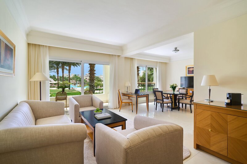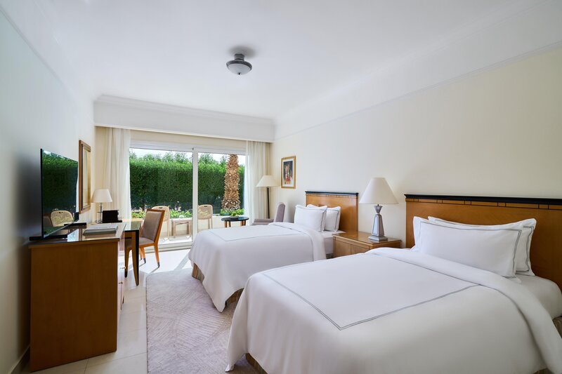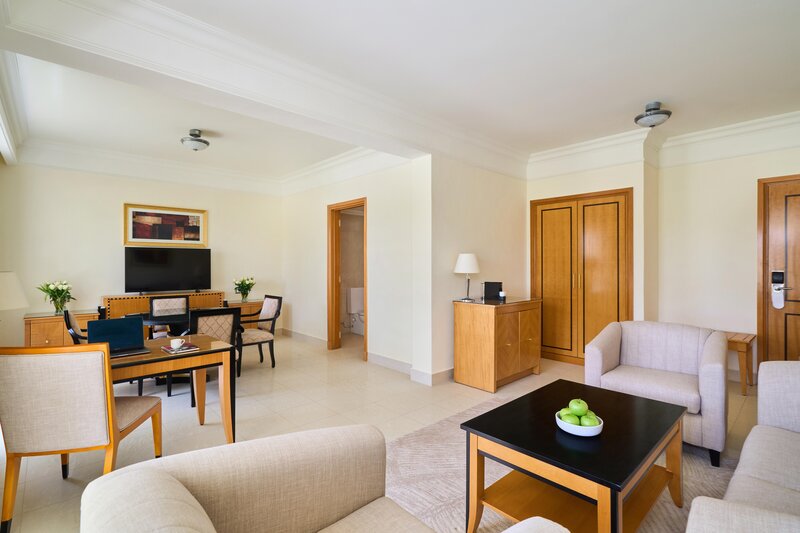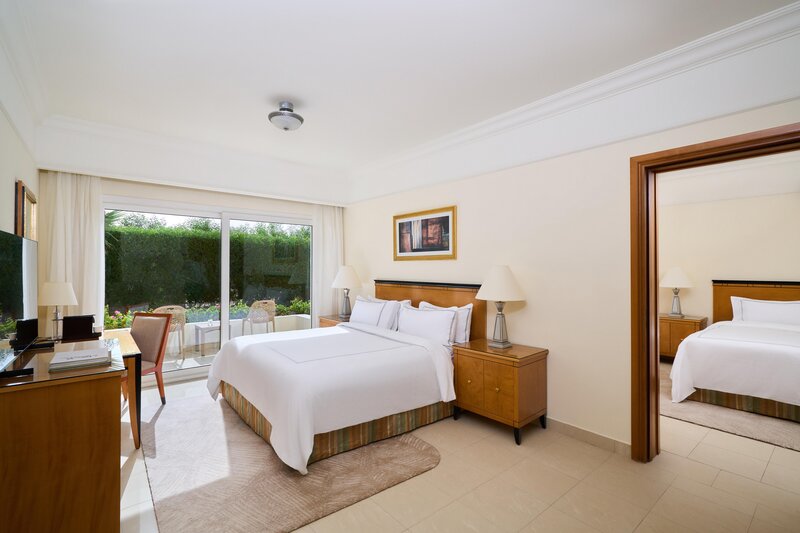 Wohnen: Deluxe-Doppelzimmer (DZD, ca. 45 qm), Klimaanlage, Minibar, Safe. Bad/Dusche, WC, Föhn, wahlweise mit Garten-/Poolblick. Max. 2E+1K, zur Alleinnutzung buchbar (EZD)