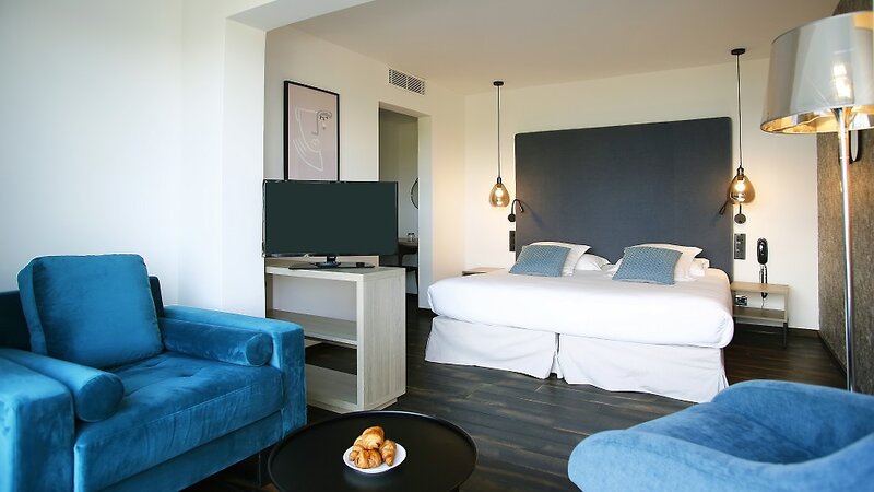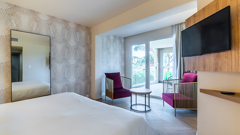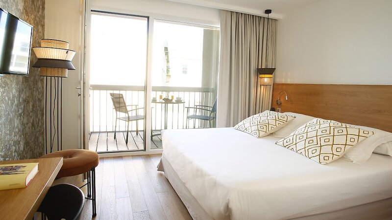 Doppelzimmer Deluxe Stadtblick (ca. 32 m²) für vier Personen mit Doppelbett oder 2 Einzelbetten, Bad/WC, Klimaanlage, Sat.-TV, Telefon, Minibar, Safe, W-Lan, Balkon. Seitlicher Stadtblick.