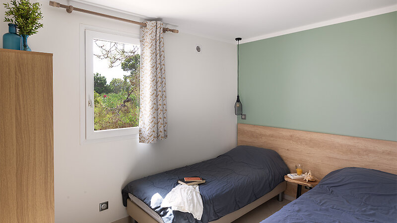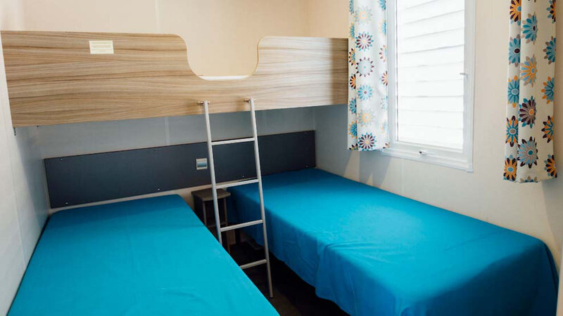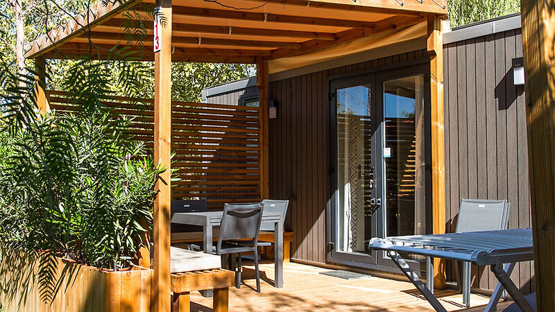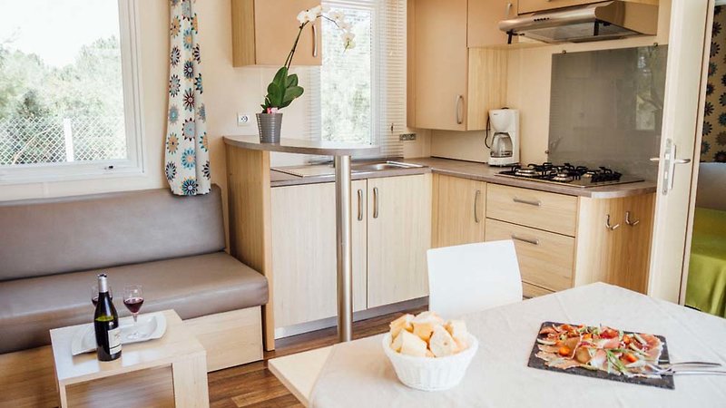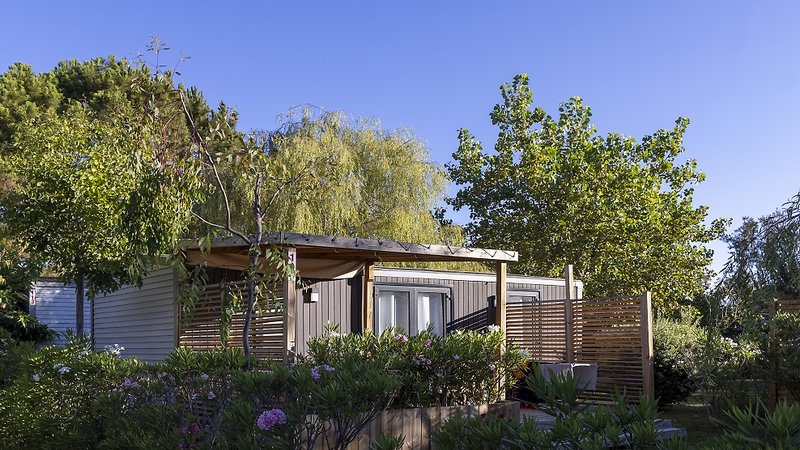 Cottage Nepita (ca. 30 m²): 3-Zimmer-Mobilhome für bis zu 5 Personen, Schlafzimmer mit franz. Doppelbett, Schlafzimmer mit Einzel- und Stockbett, Wohnbereich mit Sitzecke, Küche (mit Mikrowelle), Bad mit Dusche, Klimaanlage, W-Lan (gegen Gebühr), überdachte und möblierte Terrasse. Die Cottages Nepita befinden sich im ruhigen hinteren Teil der Anlage.