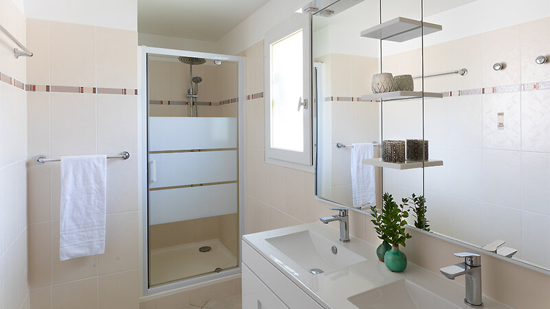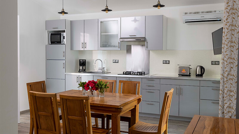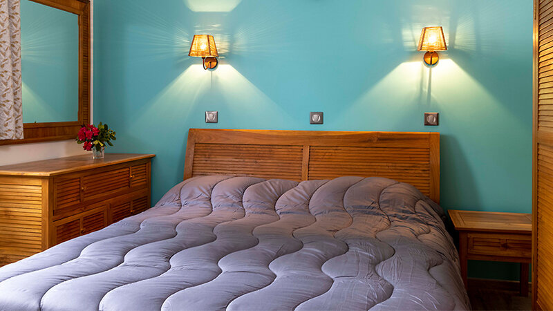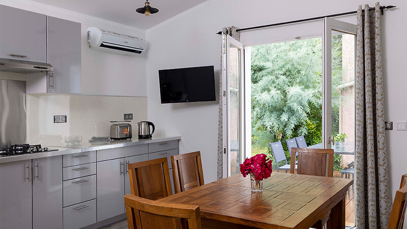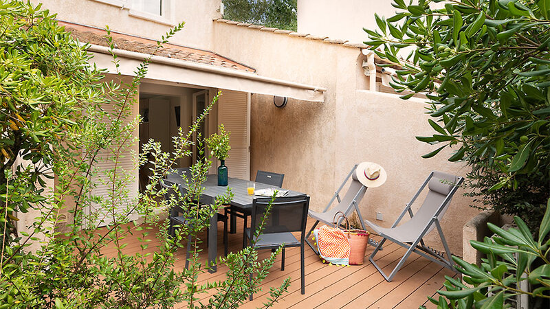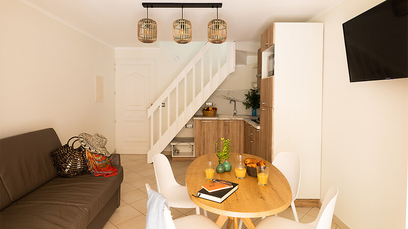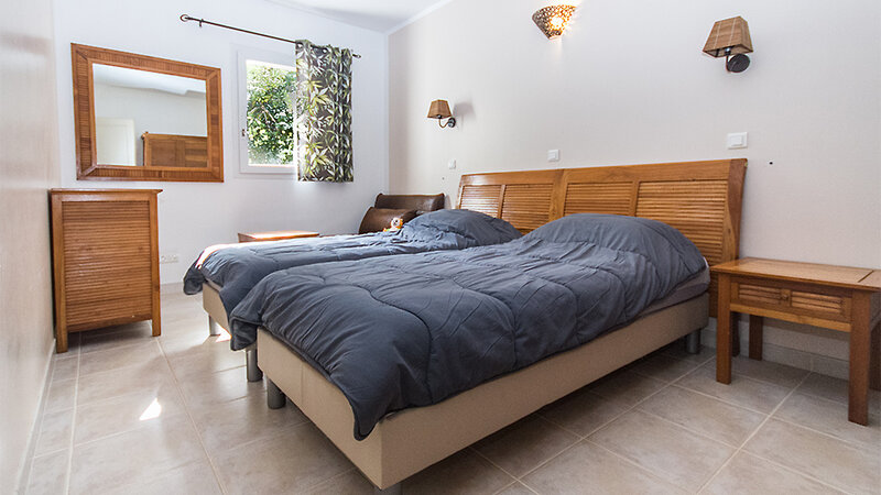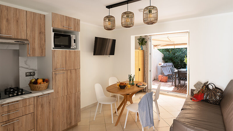 Minivilla T2 (ca. 30 m²): 2-Zimmer-Wohnung bis zu 4 Personen, Schlafzimmer mit 2 Einzelbetten, Wohn-/Schlafbereich mit Schlafsofa, TV, Küche (mit Geschirrspüler und Mikrowelle), Bad mit Dusche, Föhn, Klimaanlage, W-Lan (gegen Gebühr), Safe (gegen Gebühr), möblierte Terrasse oder Balkon. Im vorderen Teil der Anlage in Strandnähe.