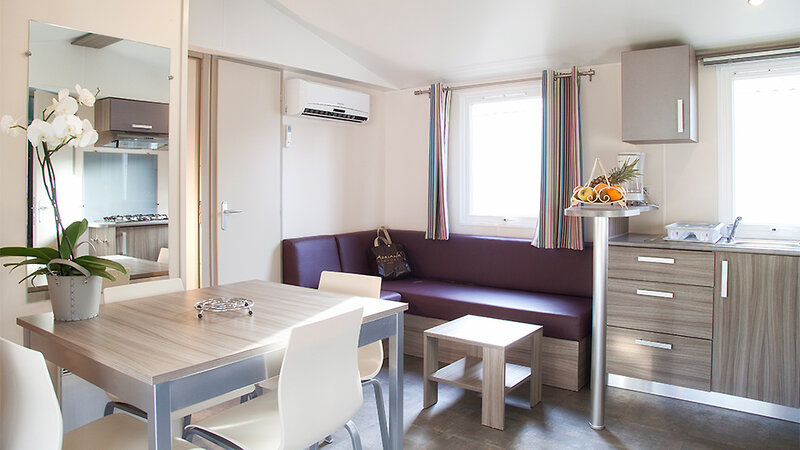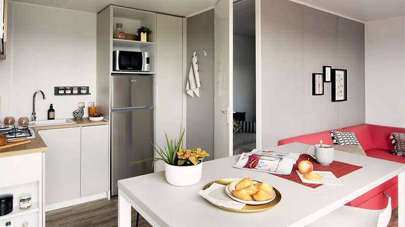 Cottage Urbino (ca. 30 m²): 3-Zimmer-Mobilhome für bis zu 5 Personen, Schlafzimmer mit franz. Doppelbett, Schlafzimmer mit Einzel- und Stockbett, Wohnbereich mit Sitzecke, Küche (mit Geschirrspüler und Mikrowelle), Bad mit Dusche, Föhn, Klimaanlage, TV, W-Lan (gegen Gebühr), Safe, überdachte und möblierte Terrasse. Die Unterkünfte liegen im vorderen Teil der Anlage in Strandnähe.