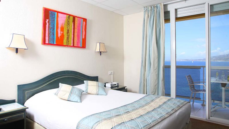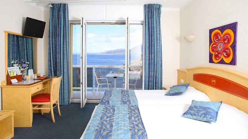 Dvojlôžková izba s výhľadom na more (cca 17 m²): Dvojlôžková izba s výhľadom na more pre dve osoby s francúzskou manželskou posteľou alebo dvomi samostatnými lôžkami, kúpeľňa s vaňou alebo sprchou, sušič vlasov, klimatizácia, TV, trezor, minibar alebo chladnička (za poplatok ), zariadená terasa alebo balkón s výhľadom na more . Je možné rezervovať si izbu so spojovacími dverami. Možno rezervovať aj ako dvojlôžkovú izbu pre jednu osobu.
