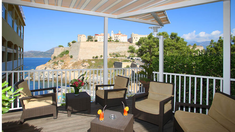 Doppelzimmer Superior (ca. 15 m²): Doppelzimmer Superior für zwei Personen mit französischem Doppelbett oder zwei Einzelbetten, Bad mit Dusche, Föhn, Klimaanlage, TV, Safe (Kaution), Minibar bzw. Kühlschrank (gegen Gebühr),möblierter Balkon oder Terrasse und Blick auf die Zitadelle von Calvi. Auch als Doppelzimmer zur Alleinbenutzung buchbar.