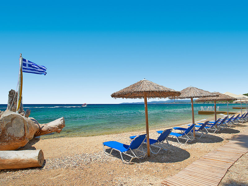 Lage: Vom flach abfallenden Strand (Sand/Kies) nur durch eine kleine, kaum befahrene Seitenstraße getrennt. Bis Nikiti ca. 9 km, bis Neo Marmaras ca. 11 km (Shuttlebusservice gegen Gebühr).