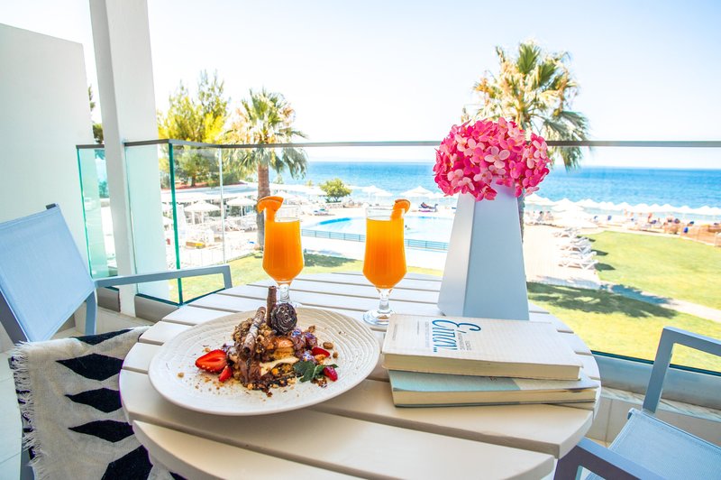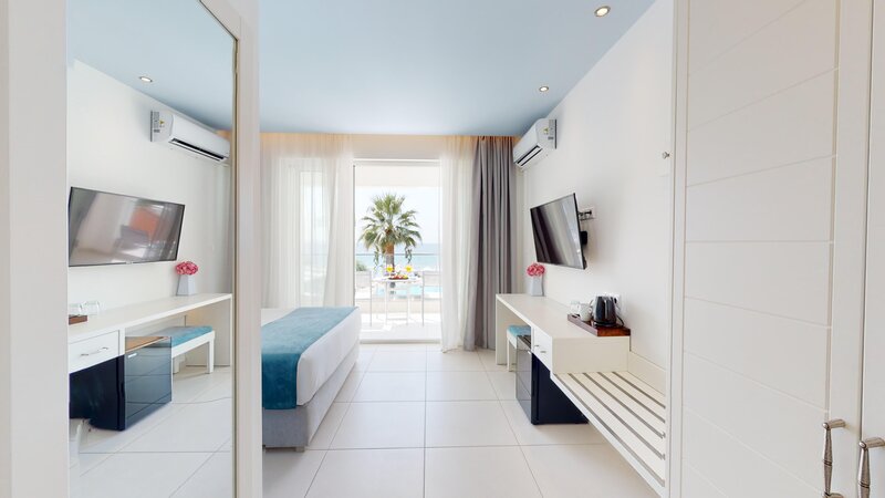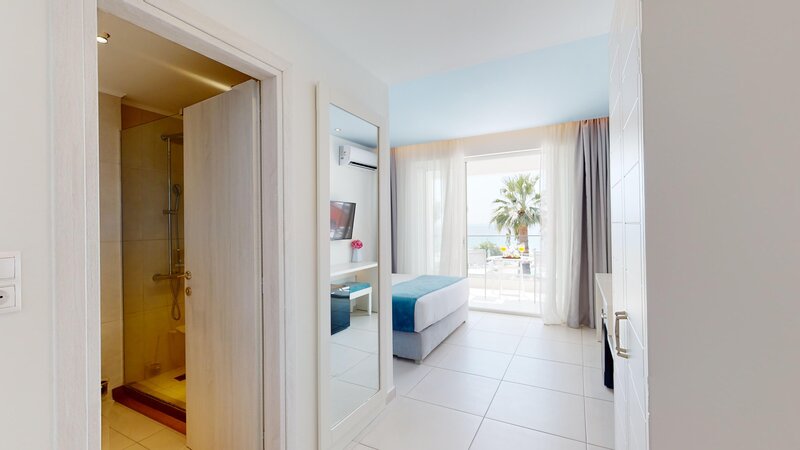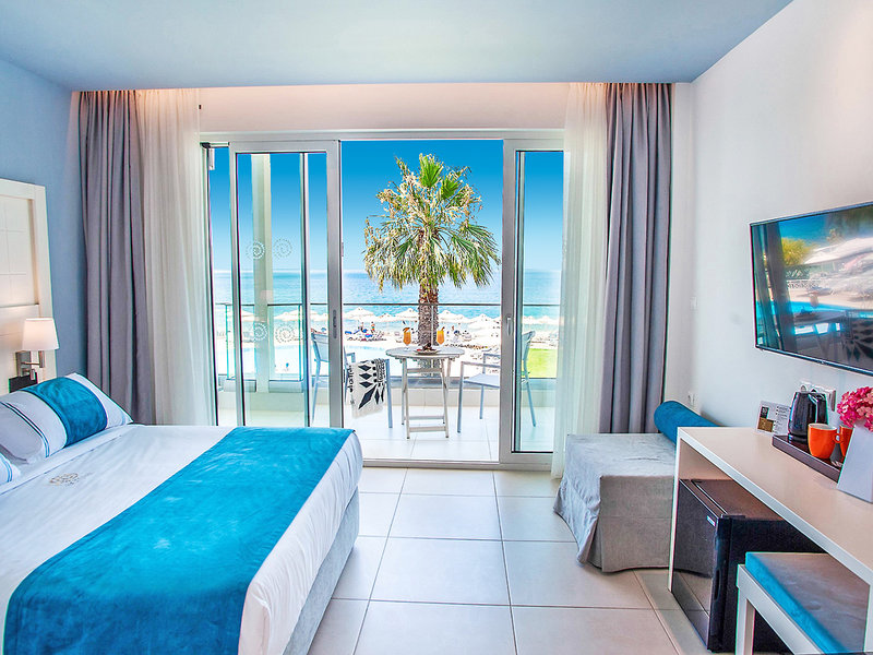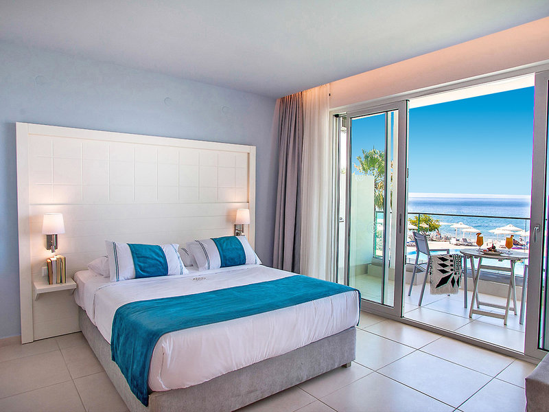 Ubytovanie: Dvojlôžková izba Superior (DSP, cca 22 m²), klimatizácia, minibar, kávovar/čajník, Wi-Fi, TV, telefón, trezor. Sprcha, WC, župany, papuče a sušič vlasov. Balkón alebo terasa, voliteľne s výhľadom na more (DSM). Max. 3 dospelí.