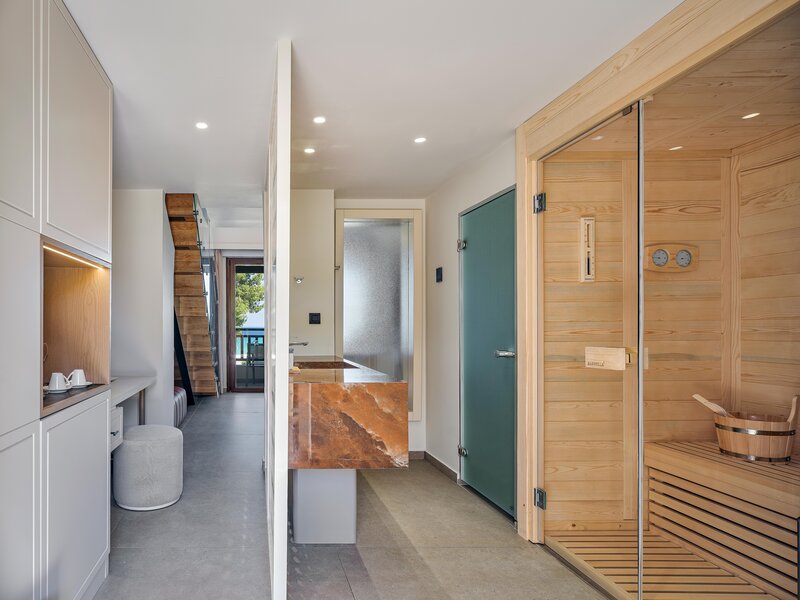 Špeciálny luxus pre vašu dovolenku: junior suite (JS, cca 38 m2), kombinovaná obývacia izba/spálňa, predsieň s rozkladacou pohovkou, klimatizácia, chladnička, kávovar/čajník, WiFi, TV, telefón, trezor. Vaňa/sprcha, WC, fén. Balkón/terasa. Výhľad na bazén. Max. 3E+1K