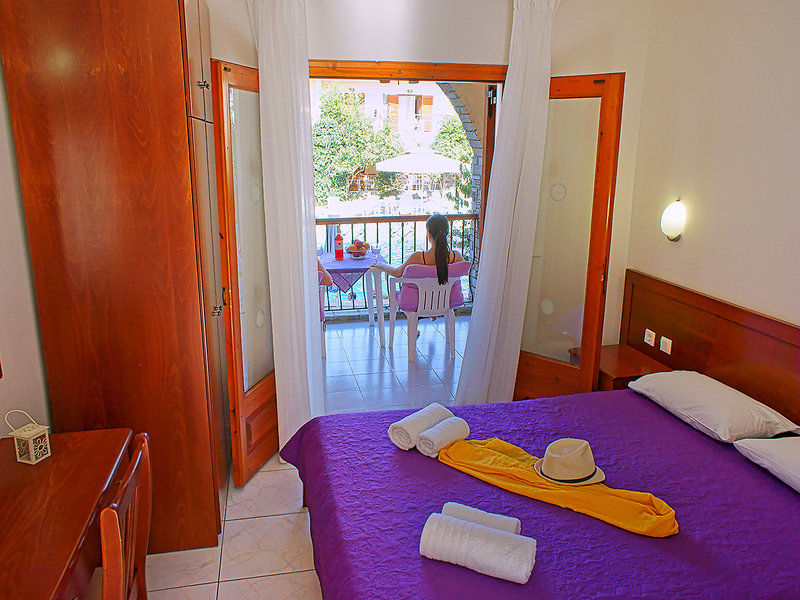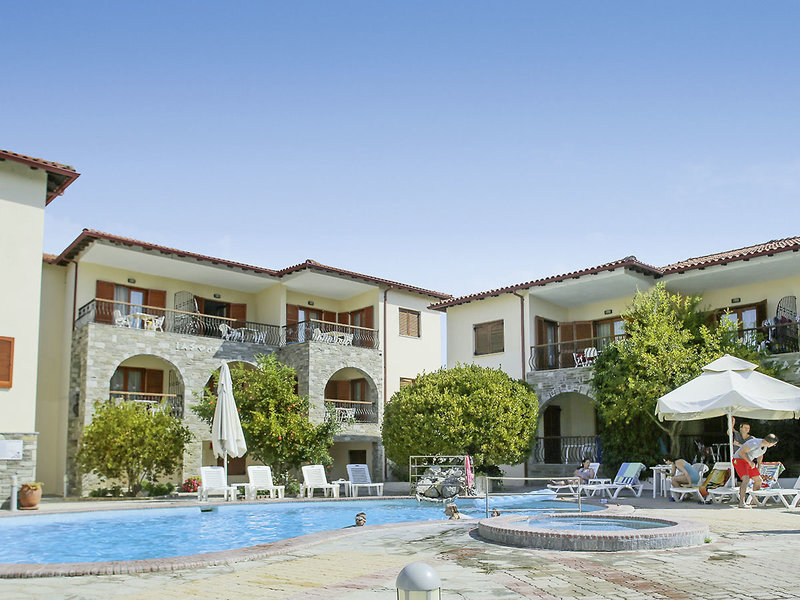 Ausstattung: Im griechischen Dorfstil gestaltete kleine Ferienanlage mit Swimmingpool, Sonnenterrasse, Liegen, Schirmen (am Strand gegen Gebühr), Pool-/Snackbar. Empfangsbereich mit Rezeption (stundenweise besetzt), WLAN und TV-Ecke. Landeskategorie: 3 Sterne, 32 Wohneinheiten, 2 Etagen.