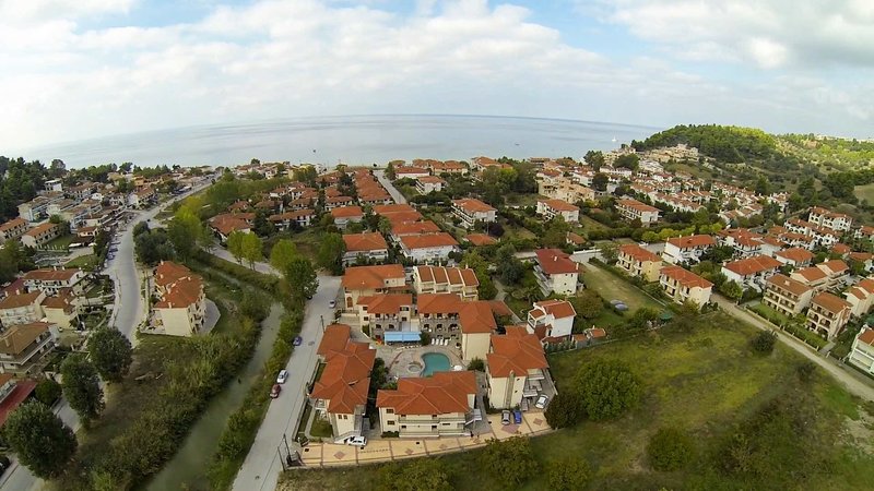 Vybavenie: Tento komplex, navrhnutý v štýle gréckej dediny, má 32 izieb rozmiestnených v niekoľkých budovách a ponúka recepciu s možnosťou prenájmu trezorov, vstupnú halu, bar a raňajkovú miestnosť. V celom komplexe je k dispozícii bezplatné Wi-Fi pripojenie. V dobre udržiavanom areáli sa nachádza bazén (zatvorený od 14:30 do 16:30 v júli a auguste) so samostatným detským bazénom a slnečnou terasou. Lehátka a slnečníky sú pri bazéne k dispozícii zadarmo; na pláži sú k dispozícii za poplatok. Verejné parkovanie je bezplatné a jeho dostupnosť závisí od dostupnosti.