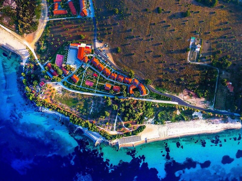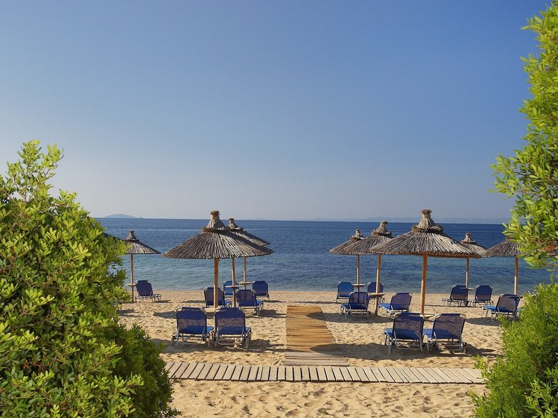 Lage & Umgebung Am Rand des Ortes Metamorfosis, am Anfang der Halbinsel Sithonia gelegen. Durch den Garten und eine Grünanlage sind es ca. 70 m bis zum flach abfallenden Sand-/Kiesstrand mit kristallklarem Wasser. Transferzeit: ca. 1 Stunde.