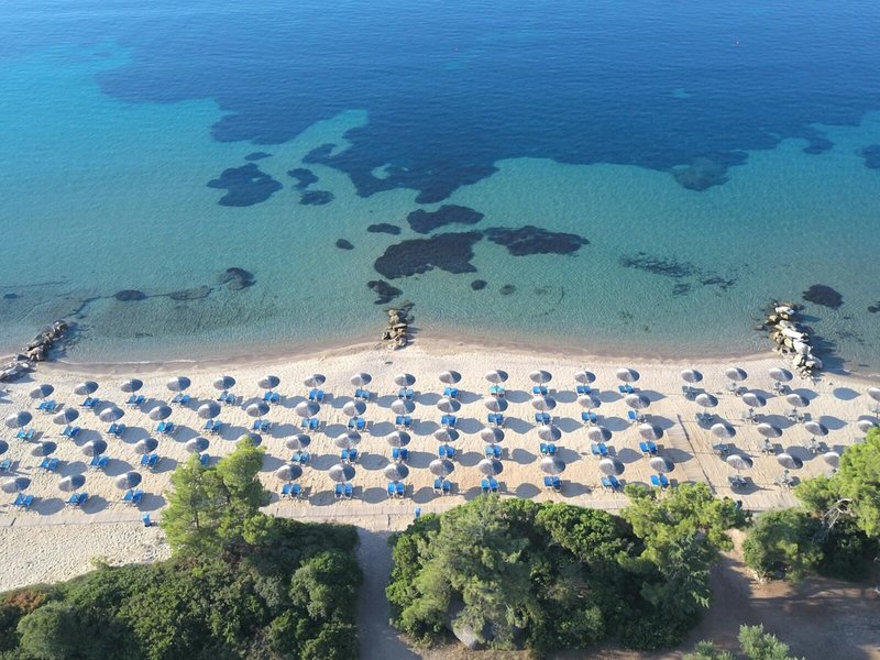 Poloha a okolie Nachádza sa na okraji mesta Metamorfosis, na začiatku polostrova Sithonia. Cez záhradu a zelenú plochu je to cca 70 m na mierne sa zvažujúcu pieskovo/kamienkovú pláž s krištáľovo čistou vodou. Čas prenosu: cca 1 hodina.
