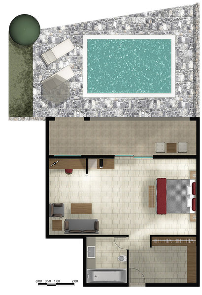- 2 Bedroom Suite Garden View Private Pool (SUX2), im Hauptgebäude, Gartenblick, ca. 100 m², Gesamtanzahl der Räume in diesem Zimmertyp: 2, Aufteilung wie folgt: kombiniertes Wohn-/Schlafzimmer, bestehend aus 2 Zimmern, optisch getrennt durch Schiebetür, 2 Einzelbetten, 1 King Size Bett, Babybett, Moskitonetz, Klimaanlage: individuell regelbar, kalt, warm, Heizung: individuell regelbar, Fußboden: Fliesenboden, Safe, Sofa, Schreibtisch, Nespressomaschine, Kaffee-/Teezubereiter, Wasserkocher, Minibar, Telefon, Internet: WLAN/WiFi, Fernseher: Flatscreen, deutsches Programm, Sat-TV, Roomservice, Reinigungsservice, Dusche, Badewanne, Terrasse: mit Liegestühlen, mit Sitzgelegenheit, mit Plunge Pool