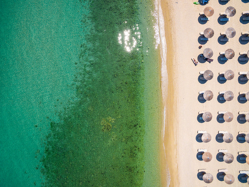 - Sand-/Kieselstrand: flach abfallend, Sonnenschirme, Liegen