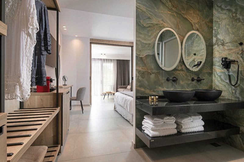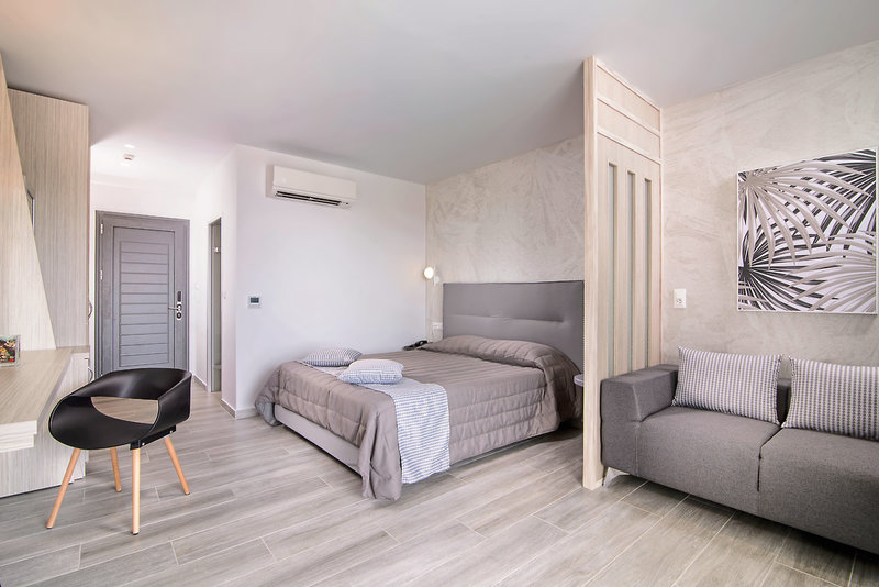- 26-30 qm, Juniorsuite, Meerblick (seitlich), kombinierter Wohn-/Schlafraum, Sitzecke, 1 Doppelbett, 1 Sofabett, Dusche, WC, Haartrockner, Klimaanlage, Heizung, Safe, 2 TVs (Sat-TV, Flachbildschirm), Kühlschrank, Balkon oder Terrasse (möbliert)