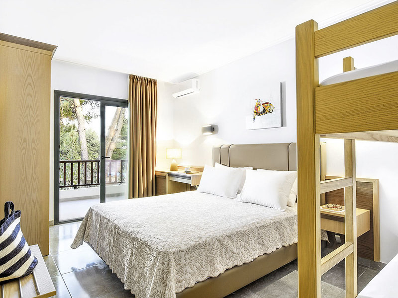 Familienzimmer (FZ, ca. 20 qm), Klimaanlage, kleiner Kühlschrank, TV, Telefon, Safe. Dusche, WC, Föhn. Zusätzliches Etagenbett. Balkon oder Terrasse mit Gartenblick. Max. 2E+2K