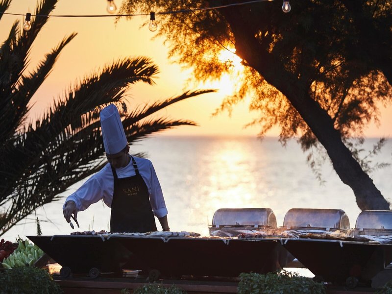 - Jedlo v okolí: Nasledujúce reštaurácie v celom rezorte sú k dispozícii na obed a večeru, ak je rezervovaná polpenzia alebo plná penzia: Poseidon (bufet, Sani Beach), Olympos (bufet, Sani Club), Psarogiannos (set menu, Sani Marina), Vosporos ( set menu Menu, Sani Marina) a Makaróny (set menu, Sani Marina). Okrem toho sú vo večerných hodinách k dispozícii nasledujúce reštaurácie so stanoveným menu: Grill pri bazéne, Cabana, Pines, Dunes a Artemis. Ostatné jedlá v à la carte reštauráciách (mimo stanovené menu) sú k dispozícii za príplatok, v tomto prípade bude pre dospelých a deti pripočítaný kredit