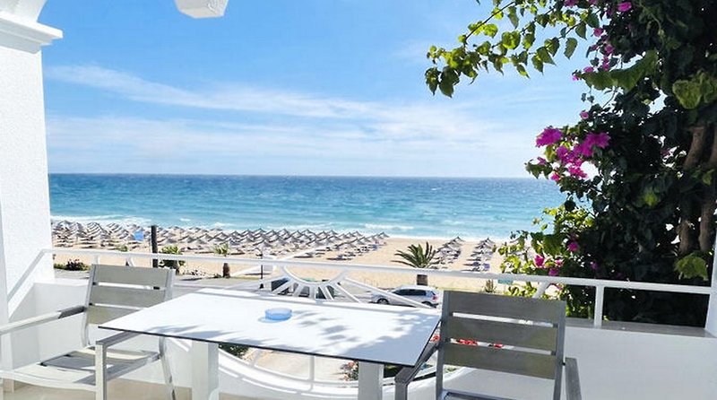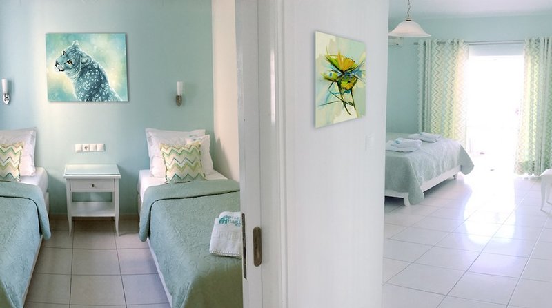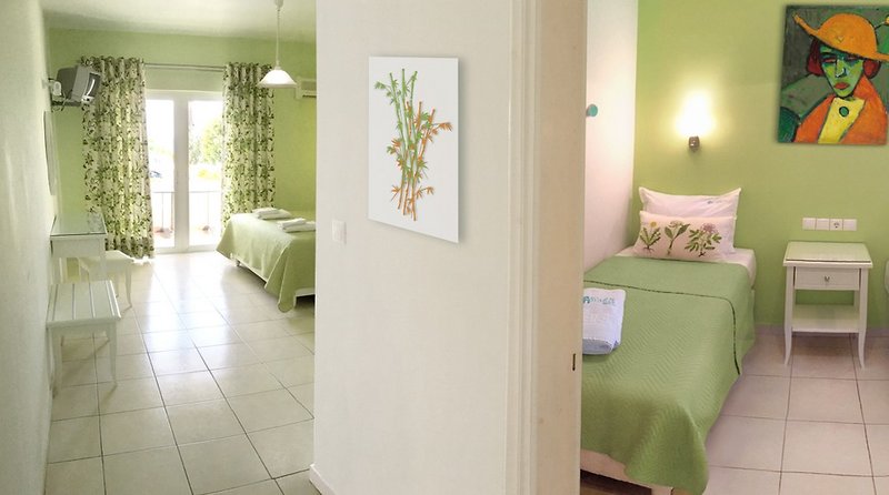 Familienzimmer Meerblick (ca. 40 m²): Familienzimmer für bis zu 4 Personen mit Doppelbett im Wohnraum, separates Schlafzimmer mit zwei Einzelbetten, Bad mit Dusche (nicht renoviert wie der Rest des Zimmers), Föhn, Klimaanlage, TV, W-Lan, kleiner Kühlschrank, Kaffeemaschine, Wasserkocher, möblierter Balkon oder Terrasse mit Meerblick.