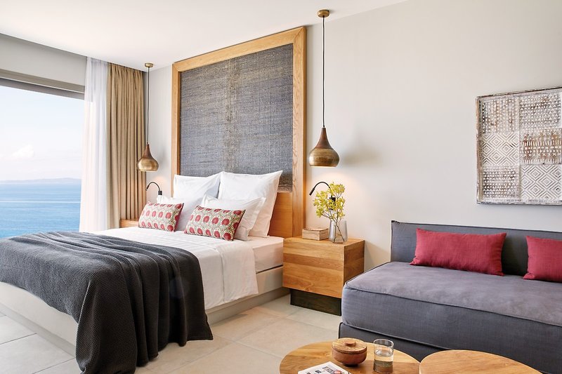 - 31-35 qm, Doppel, Deluxe, Meerblick, kombinierter Wohn-/Schlafraum, 1 Sofabett, Dusche, Haartrockner, Klimaanlage, Minibar, Safe, TV (Sat-TV, Flachbildschirm), WLAN, Espressomaschine, Kaffee/Tee, Terrasse (möbliert), Privatpool, hochwertige Badartikel