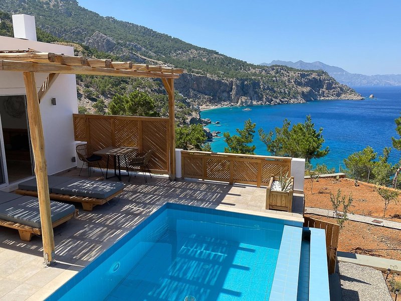 - Terrasse mit privatem Pool, Sonnenliegen und Meerblick