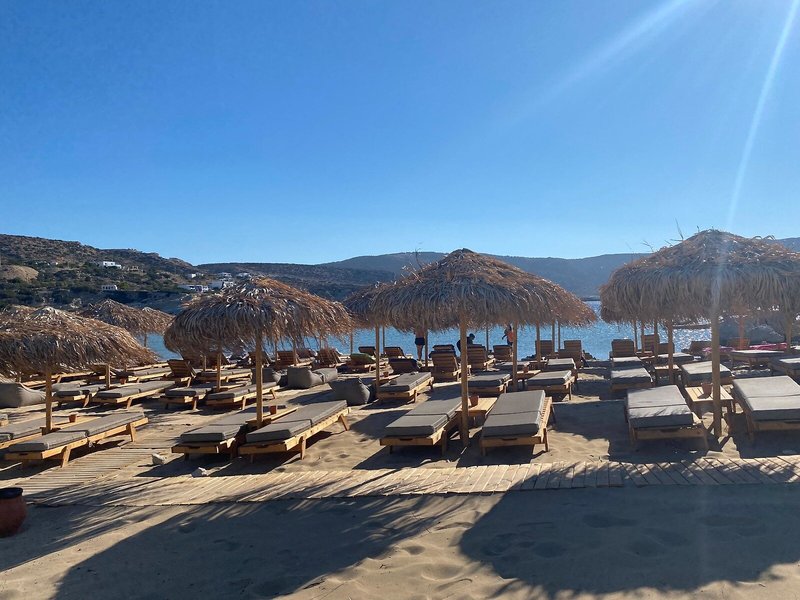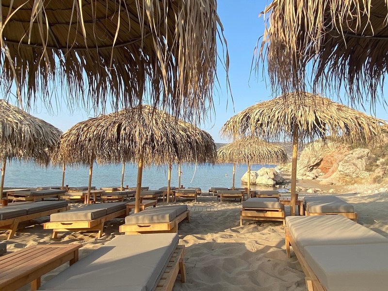 - Pláž MEGALI AMOOPI: piesková, verejná s vlastnou hotelovou časťou, ležadlá: za poplatok, slnečníky: za poplatok