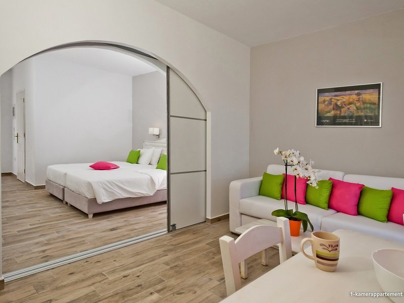 Šport a fitnes: Vonkajší bazén s detskou časťou je ideálny na aktívny oddych a pravidelné vodné cvičenie. Osviežujúce nápoje v bare pri bazéne a upokojujúca relaxácia vo vírivke naladia všetkých milovníkov vody. Slnečná terasa s ležadlami a slnečníkmi je ideálnym miestom na opaľovanie. Pre tých, ktorí majú radi fyzickú aktivitu, je k dispozícii tenis a rybolov. Hotel sa venuje aj milovníkom vodných športov, ako je windsurfing, šnorchlovanie a potápanie. Hostia si môžu vybrať aj z fitnescentra a hodín aerobiku. Apartmánový hotel ponúka rôzne wellness možnosti vrátane kúpeľov, sauny, parného kúpeľa, hammamu a masážnych procedúr. Ďalšie možnosti voľného času zabezpečuje zábavný program a živá hudba.