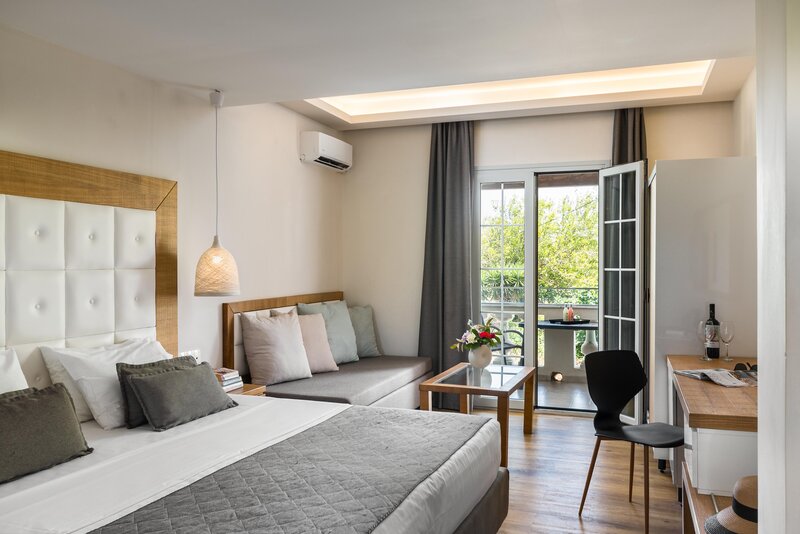Bývanie: Dvojlôžková izba Premium (DZP, cca 29 m2), klimatizácia, chladnička, TV, WiFi, trezor. Sprcha, WC a fén. Balkón/terasa. Maximálne 3E. Voliteľne s terasou a priamym prístupom k bazénu (DPS),