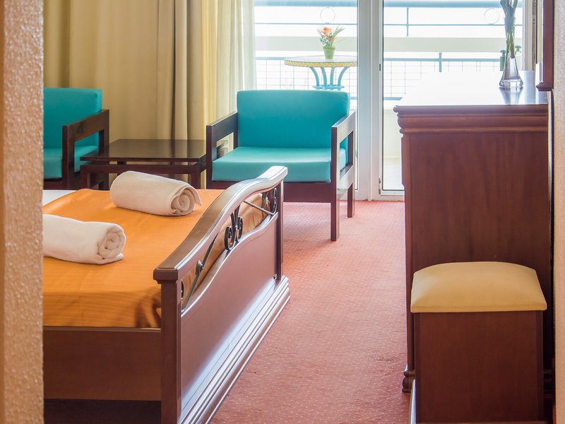Ubytovanie: Klimatizácia zabezpečuje príjemnú vnútornú klímu. Balkón je štandardom vo väčšine izieb. Izby sú vybavené manželskou posteľou. Samostatné spálne sú ďalším vybavením, ktoré si môžete rezervovať. K dispozícii je aj detská postieľka a prístelka. Trezor poskytuje najlepšiu ochranu majetku hostí. Pre jednoduchšie vlastné stravovanie sú ubytovacie jednotky vybavené chladničkou a minichladničkou. Telefón s priamou voľbou, TV so satelitným/káblovým príjmom, rádio a Wi-Fi (bezplatné) poskytujú maximálne pohodlie počas dovolenky. Kúpeľňa so sprchovacím kútom a vaňou je vybavená aj sušičom vlasov. Rodinné izby sú k dispozícii pre rodičov s deťmi.