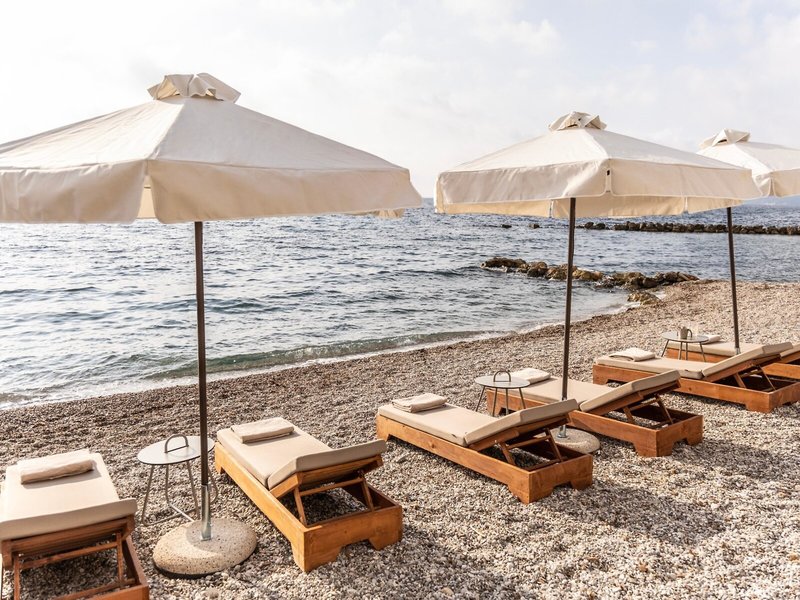 - Strand: Kies, Liegestühle, Sonnenschirme