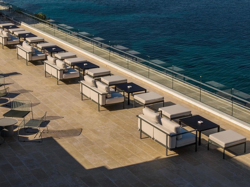 - Triple Room Sea View (DZM3), Dreibettzimmer, Nichtraucherzimmer, im Hauptgebäude, im Nebengebäude, Meerblick, ca. 25 - 26 m², letzte Komplettrenovierung 2025, Gesamtanzahl der Räume in diesem Zimmertyp: 1, Aufteilung wie folgt: 1 Schlafzimmer, 1 Schlafsofa (80x200cm), Klimaanlage: ohne Gebühr, Juni - September, individuell regelbar, kalt, Fußboden: Fliesenboden, Safe: ohne Gebühr, Schreibtisch, Nespressomaschine, Kaffee-/Teezubereiter, Wasserkocher, Minibar: ohne Gebühr, Softdrinks, Wasser: ohne Gebühr, alkoholische Getränke, Telefon, Internet: WLAN/WiFi, Fernseher: Sat-TV, Roomservice: gegen Gebühr, Dusche, Regendusche, WC, Bademantel, Slipper, Föhn, Kosmetikspiegel, Balkon: mit Sitzgelegenheit