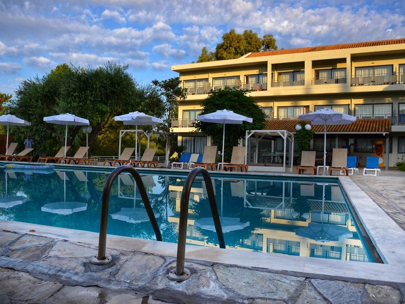 Lage & Umgebung Das Hotel liegt in Dassia, eines der beliebtesten Ferienresorts auf Korfu, ungefähr 1 km m vom Strand entfernt, etwa 200 m vom Zentrum und rund 12 km von Korfu-Stadt und dem Flughafen entfernt. Zum Zentrum des beliebten Resorts sind es ca. 15 min. Hier können die Gäste eine gute Auswahl an Geschäften, Tavernen und Bars finden.