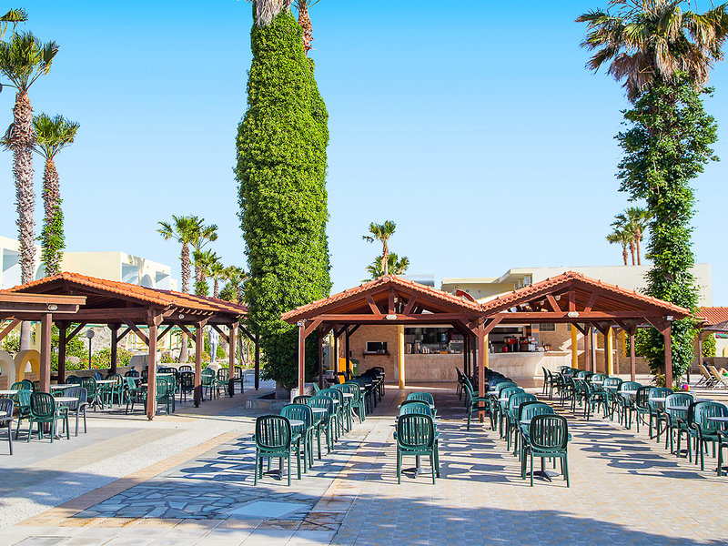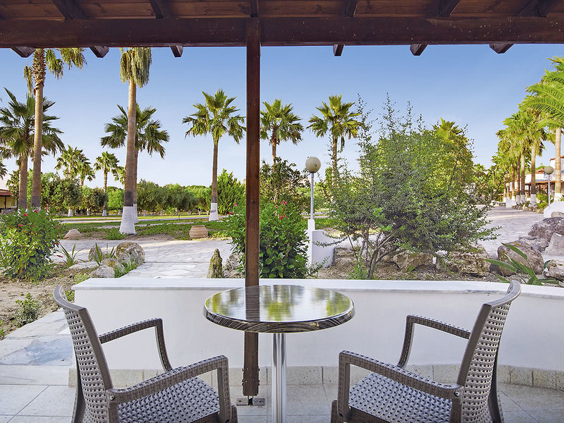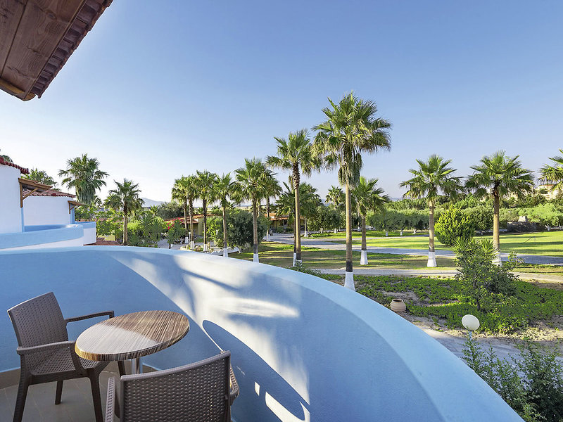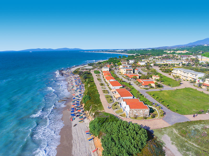 Ausstattung: Familienfreundliches Ferienhotel mit Haupthaus und mehreren 2-stöckigen Wohngebäuden. Große Gartenanlage. Swimmingpool, Sonnenterrasse, Liegen, Schirme am Pool, Pool-/Snackbar mit Sitzterrasse. Empfangshalle, Rezeption, WLAN (an der Rezeption und am Pool), Restaurant, Themenrestaurant (italienisch, geöffnet von Mitte Mai bis Mitte Oktober), Bar mit Außenterrasse, Minimarkt, Amphitheater. Strandbar am Hauptstrand (Juni-September). Landeskategorie: 4 Sterne, 347 Einheiten, 2 Etagen.