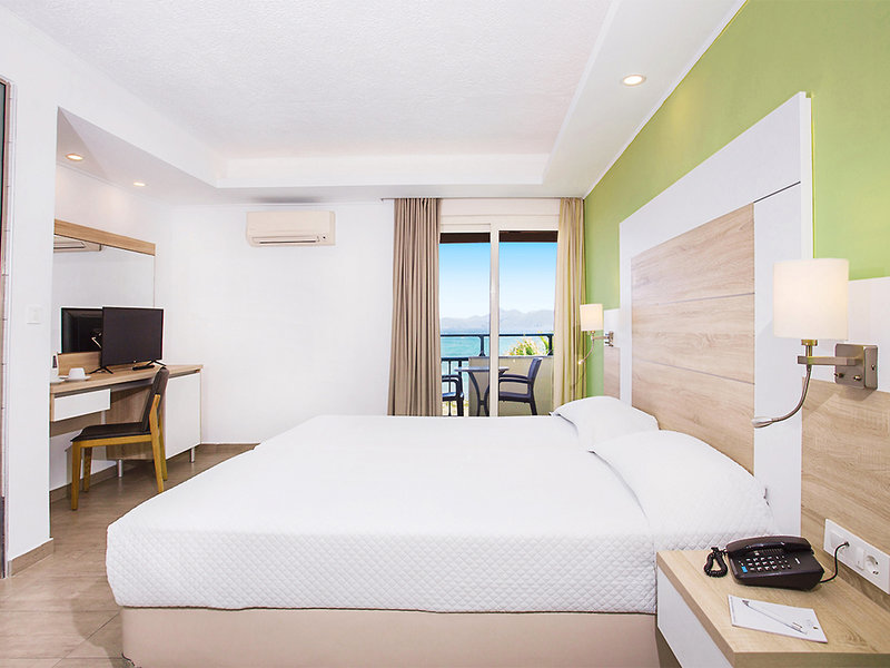 Superior-Doppelzimmer (DZS, ca. 23 qm), renoviert, Klimaanlage, Kühlschrank, Kaffee-/Teezubereiter, TV, WLAN, Safe. Dusche, WC, Föhn, Slipper. Balkon oder Terrasse mit Meerblick. Max. 3E