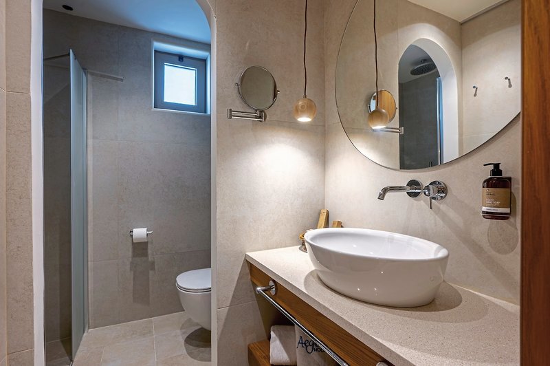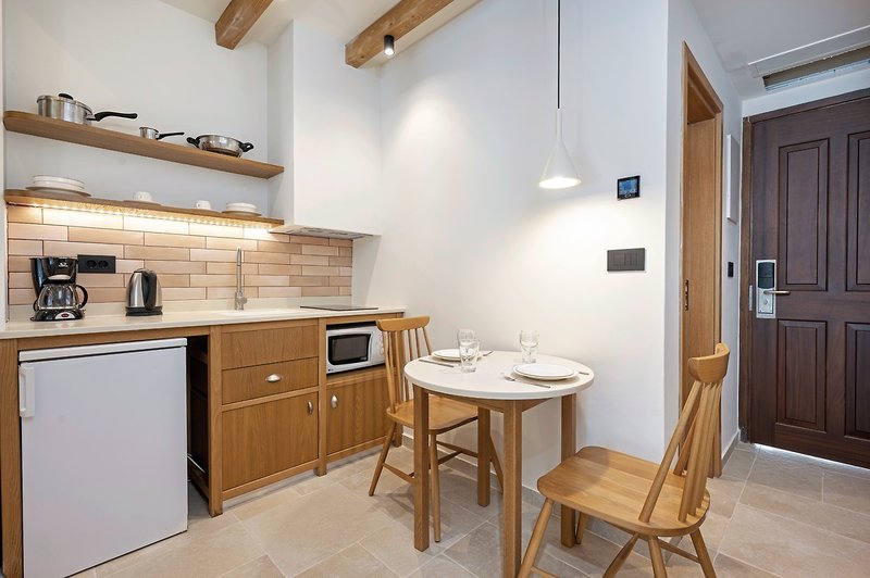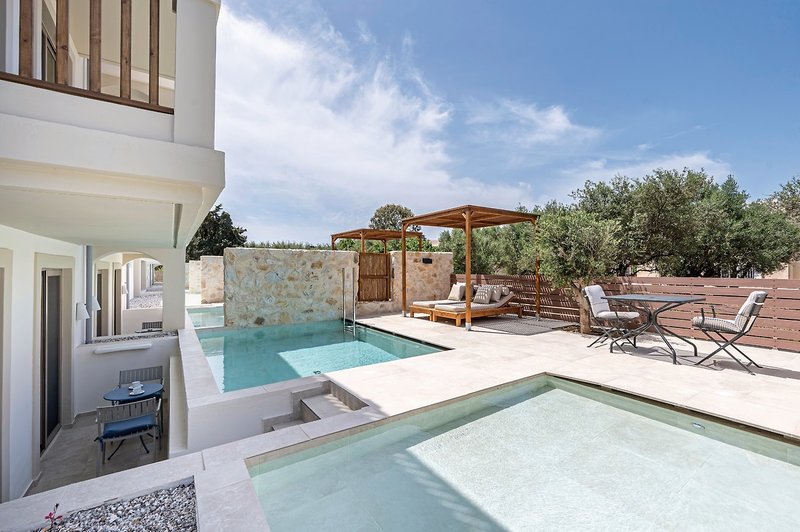 - 41-45 qm, Appartement, Superior, 1 separates Schlafzimmer, kombinierter Wohn-/Schlafraum, Dusche, WC, Haartrockner, Klimaanlage, Safe (kostenpflichtig), TV (Sat-TV), Küche, Kühlschrank, Balkon oder Terrasse, Privatpool