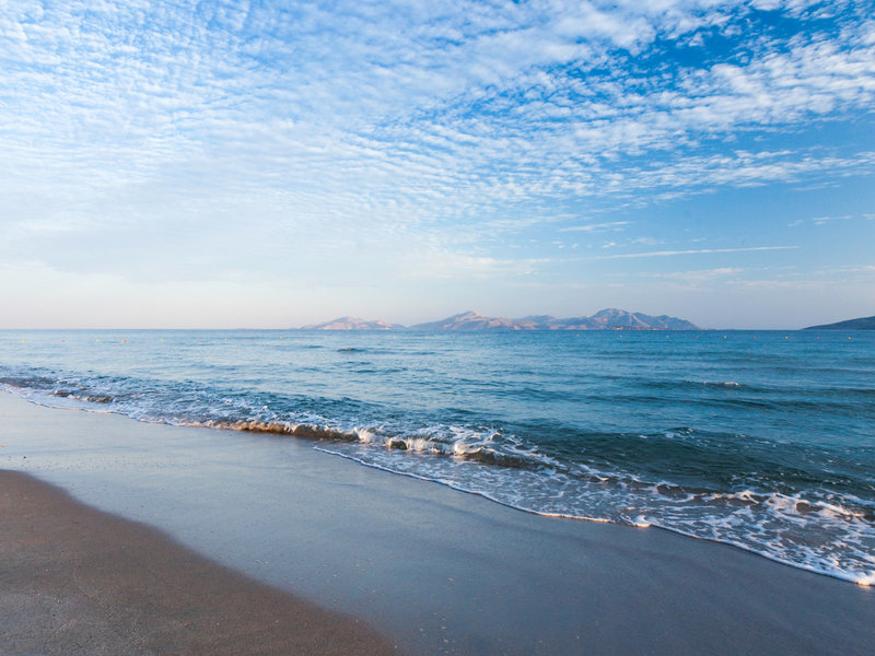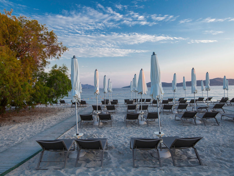 - Strand „Marmari“: Sand, flach abfallend, Liegestühle, Sonnenschirme