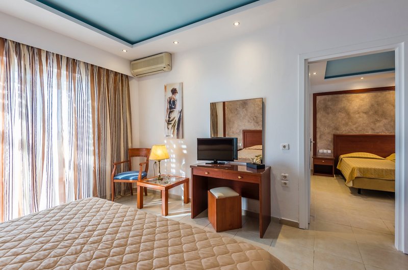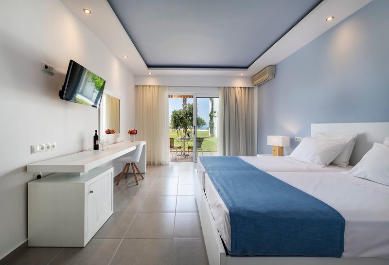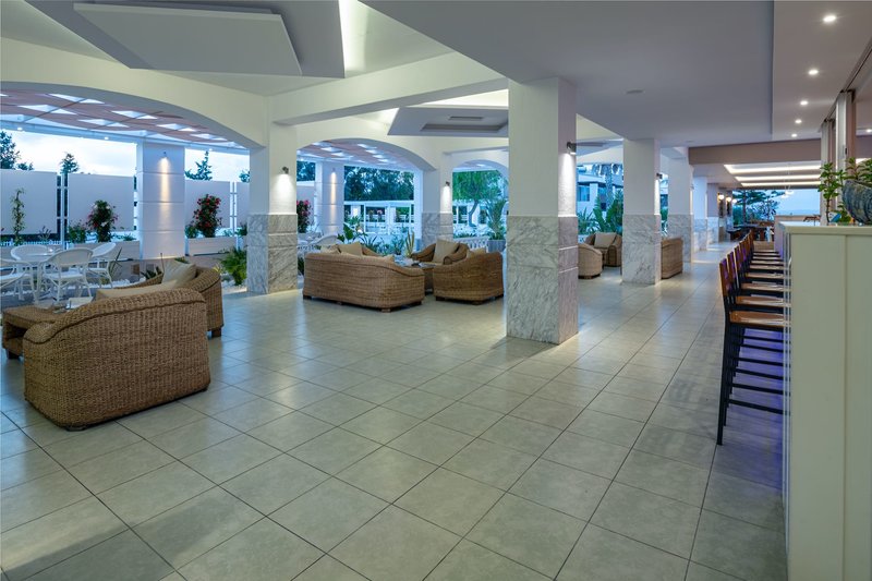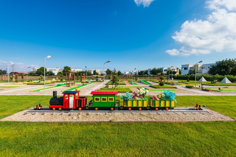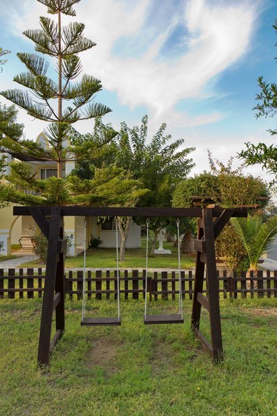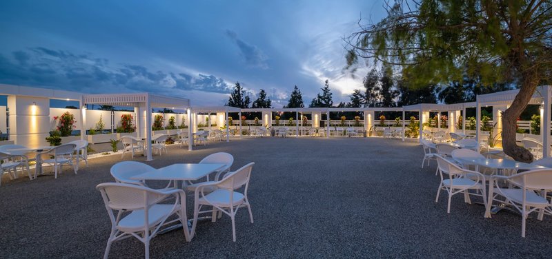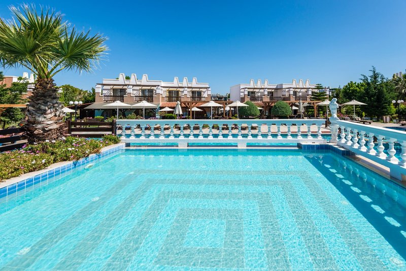 Vybavenie: Rezort je postavený v štýle gréckej dediny a pozostáva z hlavnej budovy a niekoľkých dvojposchodových bungalovov. Celý komplex sa rozprestiera na ploche 70 000 m² a ponúka celkovo 311 izieb, krásne záhrady, recepciu, vstupnú halu s Wi-Fi pripojením, hlavnú reštauráciu s terasou, minimarket a obchod so suvenírmi. V dobre udržiavanom areáli sa nachádzajú tri bazény s bezplatnými slnečníkmi a ležadlami, ako aj dva bary pri bazéne. Osušky do bazéna sú k dispozícii za zálohu; výmena je možná za malý poplatok. Ležadlá a slnečníky si môžete prenajať na pláži za poplatok. Parkovanie je k dispozícii pri hoteli.
