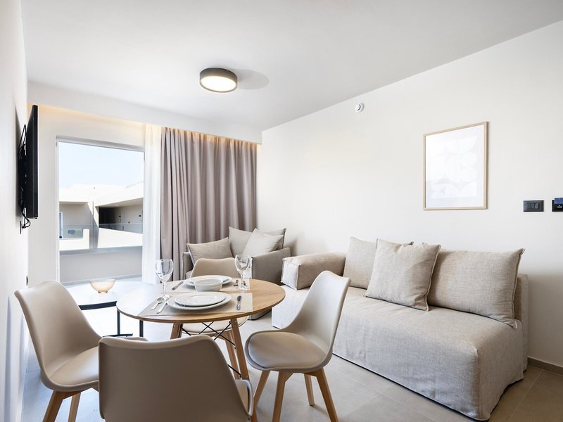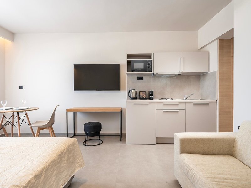 - One-bedroom apartments (APX1), Appartement, Nichtraucherzimmer, im Hauptgebäude, Poolblick, Gartenblick, ca. 31 - 33 m², letzte Komplettrenovierung 2025, Gesamtanzahl der Räume in diesem Zimmertyp: 2, Aufteilung wie folgt: Wohnzimmer, 1 Schlafzimmer, 1 Doppelbett, 1 Schlafsofa, Babybett: ohne Gebühr, Klimaanlage: ohne Gebühr, Mai - Oktober, Fußboden: Fliesenboden, Safe: ohne Gebühr, Sofa, Schreibtisch, Kochnische, Kühlschrank, Kochplatte, Mikrowelle, Wasserkocher, Internet: WLAN/WiFi: ohne Gebühr, Fernseher: Flatscreen, im Wohnbereich, Dusche, WC, Föhn, Balkon: mit Sitzgelegenheit