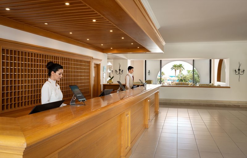 Ausstattung: Die Hotelanlage bietet eine Kombination aus griechischem Charme und modernem Ambiente. Das 5 Sterne Resort besteht aus 455 Zimmern verteilt auf ein Haupthaus mit einem Lift und mehreren bungalowartigen Gebäuden und verfügt über Empfangshalle mit 24-Stunden-Rezeption und Sitzgruppen, Restaurants (Grill-Restaurant, Fischrestaurant und Pan-Asian Restaurant Reservierung erforderlich-nach Verfügbarkeit, Crêperie, Take away Pizza "on the beach"), sieben Bars, Minimarkt, Kiosk, Boutique und Diskothek (ist nicht im All Inclusive enthalten). In der Außenanlage befinden sich die Poollandschaft mit 5 Süßwasser-Swimmingpools,1 Meerwasserbecken, Kinderbecken und ein Wasserpark mit Rutschen (10-18 Uhr/ab 6 Jahren) sowie Pool-/Strandbar. Die Sonnenterrasse ist ausgestattet mit Liegen und Schirmen, welche sowohl am Pool als auch am Strand inkludiert sind. Wi-Fi ist in der gesamten Hotelanlage inklusive.