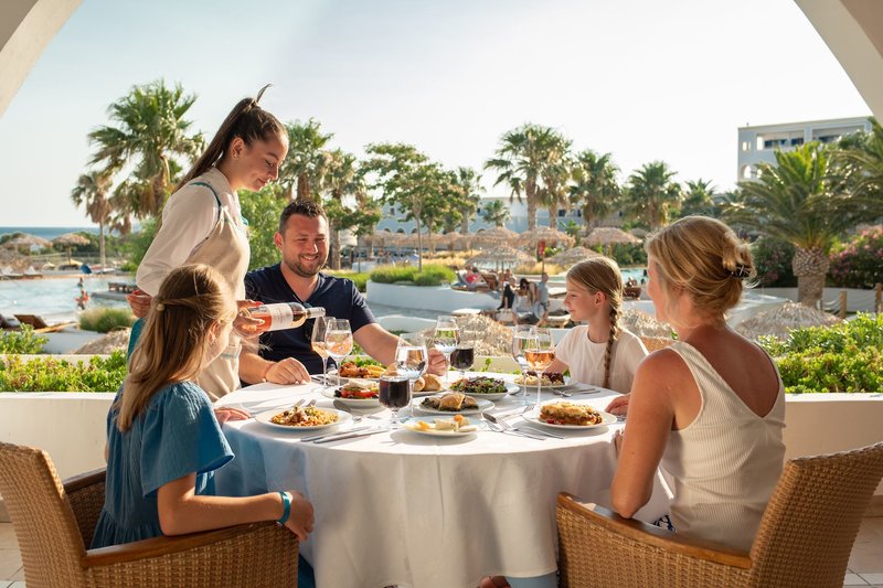 Ultra All Inclusive: Bei Mitsis werden Sie rund um die Uhr mit schmackhaften Gaumenfreuden und abwechslungsreichen Getränken versorgt. Bereits von 4-7 Uhr steht ein Frühaufsteher Frühstück bereit. Ab 7-10:30 Uhr erwartet Sie ein üppiges Frühstücksbuffet inklusive frisch gepresstem Orangensaft und griechischer Ecke mit lokalen Köstlichkeiten. Zum Mittagessen von 12:30-14:30 Uhr gibt es ebenfalls ein Buffet. Zum Abendessen von 18:30-21:30 Uhr gibt es abwechselnde Themenabende, präsentiert als großzügiges Buffet. Zudem bietet das Buffet im Hauptrestaurant zum Mittag- und Abendessen eine Salatecke. Von 22-4 Uhr steht ein kleines Mitternachtsbuffet bereit. Zu den Mahlzeiten werden Bier, Wein, Softdrinks, Wasser und Säfte gereicht sowie Espresso und Cappuccino zum Frühstück. Ein umfangreiches Angebot an À-la-carte-Restaurants (einmal pro Woche je Restaurant nach vorheriger Reservierung) und Bars lässt keine Wünsche offen. Smokey Grill À-la-carte-Restaurant (für Frühstück und Abendessen Reservierung erforderlich): Von 8–11 Uhr gibt es einen Frühstücksbuffet, Mittagsbuffet von 12:30-14:30 Uhr und zum Abendessen von 18:30–22 Uhr gibt es eine Vielzahl an gegrillten Gerichten. Fisch Restaurant „Big Blue“, À-la-carte-Restaurant (Reservierung erforderlich): Zum Abendessen kann man hier von 18:30-21:30 Uhr die frischen Fänge des Tages genießen. Asian À-la-carte-Restaurant „Ni Hao“ (Reservierung erforderlich): Hier werden von 18:30-21:30 Uhr asiatische Gerichte gezaubert. Take away Pizzeria „Oven on the Beach“: Von 11:30-18 Uhr werden Sie hier mit laufend frischer, hausgemachter Pizza versorgt. Cafe Bar „Villagio“ Direkt im Hauptgebäude, bietet das Villagio von 9–2 Uhr eine große Auswahl an Erfrischungen, lokale alkoholische und alkoholfreie Getränke, Kaffeespezialitäten und Cocktails. Zudem gibt es Crepes, Pancakes und Eiscreme (9-0 Uhr). Für die kleinen Gäste gibt es Kids-Cocktails. Bar „Casablanca“: Die Bar ist ein herrlicher Treffpunkt mit Blick auf das Meer, mit Sitzgelegenheiten im Innen- und Außenbereich. Von 17–0 Uhr gibt es bei ausgewählter Musik gibt es eine große Auswahl an Erfrischungen, lokale alkoholische und alkoholfreie Getränke, Kaffeespezialitäten und Cocktails. Main Pool Bar "Mojito": Direkt an der Poollandschaft gelegen gibt es hier von 9–0 Uhr eine große Auswahl an Erfrischungen, lokale alkoholische und alkoholfreie Getränke, Kaffeespezialitäten und Cocktails. Pool Bar „Navarone“: Von 10–18 Uhr ist die Bar ein angesagter Treffpunkt zum Freunde treffen oder um in der Whirlpool Ecke zu verweilen. Auch hier gibt es eine große Auswahl an Erfrischungen, lokale alkoholische und alkoholfreie Getränke, Kaffeespezialitäten und Cocktails. Pool Bar „Nautilus“: Direkt bei den Wasserrutschen gibt es von 10–18 Uhr Softdrinks, Säfte, Longdrinks, Bier. Thaeter Bar „Irene Pappas“: Während den Shows wird Bier, Wein, Longdrinks, alkoholische und alkoholfreie Getränke serviert. Beach Bar: Von 10–18 Uhr (im Juli/August bis 0 Uhr) gibt es an der komplett renovierten Beachbar eine Auswahl der besten Getränke. In den Abendstunden ist die Bar nur für Erwachsene geöffnet. Zudem gibt es einen Nachmittags Tee von 17-19 Uhr. Für Ausflüge wird gerne ein Lunch-Paket bereitgestellt, bitte am Vortag bis 20:30 Uhr über die Concierge Plattform anmelden. Im Hauptrestaurant gibt es einen 24 Stunden All Inclusive Service. Auf Anfrage können ohne Aufpreis folgende Speisen bereitet werden: Glutenfrei, Laktosefrei, Vegetarisch, Diabetiker Kost. Zum Abendessen wird um angemessene Kleidung gebeten.