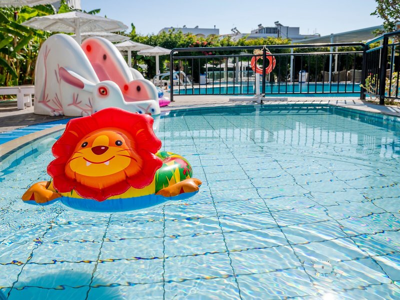 Sport & Fitness: Neben Innen- und Außenpools gibt es einen Kinderbadebereich. Pure Tiefenentspannung im Whirlpool, Vergnügen auf der Wasserrutsche und erfrischende Getränke an der Poolbar – die Gäste werden erleben, wie abwechslungsreich der Wasserspaß sein kann. Auf der Sonnenterrasse mit Liegestühlen und Schirmen lässt sich der Urlaub genießen. Das Haus bietet mit Radfahren/Mountainbiking, Tennis, Boccia, Beachvolleyball, Volleyball, Basketball und Minigolf Möglichkeiten zum Sport im Freien. Freunden des Wassersports wird Aqua-Fitness angeboten. Den Gästen steht in der Unterbringung mit einem Fitnessstudio, Tischtennis, Billard, Darts, Gymnastik und Aerobic ein breites Spektrum an Indoor-Sportarten zur Auswahl. Im Hotel werden verschiedene Wellnessangebote wie Spa, Sauna, Schönheitssalon, Massage-Anwendungen, Hydrotherapie-Anwendungen und Solarium offeriert. Kinder werden im Miniclub liebevoll betreut.