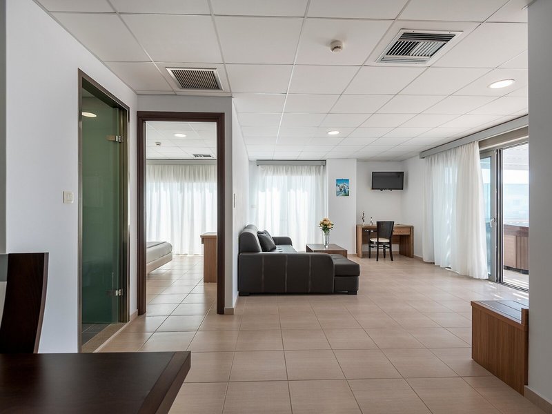 - Suita Junior s výhľadom na more (JSM1), suita Junior, v prístavbe, morská strana, výhľad na more, cca 25 - 35 m², celkový počet izieb v tomto type izby: 1, rozloženie: kombinovaná obývacia izba/spálňa, 2 jednolôžka (90x200cm), 1 rozkladacia pohovka (100x190cm), detská postieľka: zdarma, nutná požiadavka a rezervácia, klimatizácia: zadarmo, máj - október, individuálne nastaviteľná, studená, podlaha: dlažba, trezor: zdarma poplatok, pohovka, písací stôl, chladnička: zadarmo, kávovar/čajník, telefón, Internet: WLAN/WiFi: zadarmo, TV: plochá obrazovka, v spálni, satelitná TV, upratovanie: denne, zadarmo, sprcha, WC, fén, kozmetické zrkadlo, terasa: s posedením